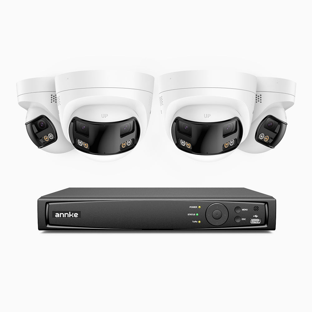 FDH800 - 8 Channel PoE Security System with 4 X 8MP UHD Dual Lens Cameras, 180° Panoramic View, Smart Dual Light Night Vision, Two-Way Audio, Active Siren & Alarm, Human & Vehicle Detection, IP67