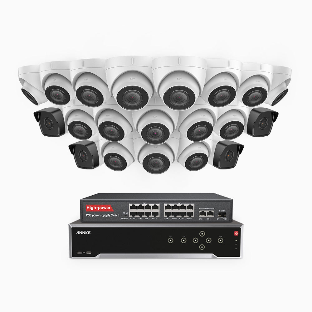 H500 - 3K 32 Channel PoE Security System with 4 Bullet & 16 Turret Cameras, EXIR 2.0 Night Vision, Built-in Mic & SD Card Slot, Works with Alexa, 16-Port PoE Switch Included ,IP67 Waterproof, RTSP Supported