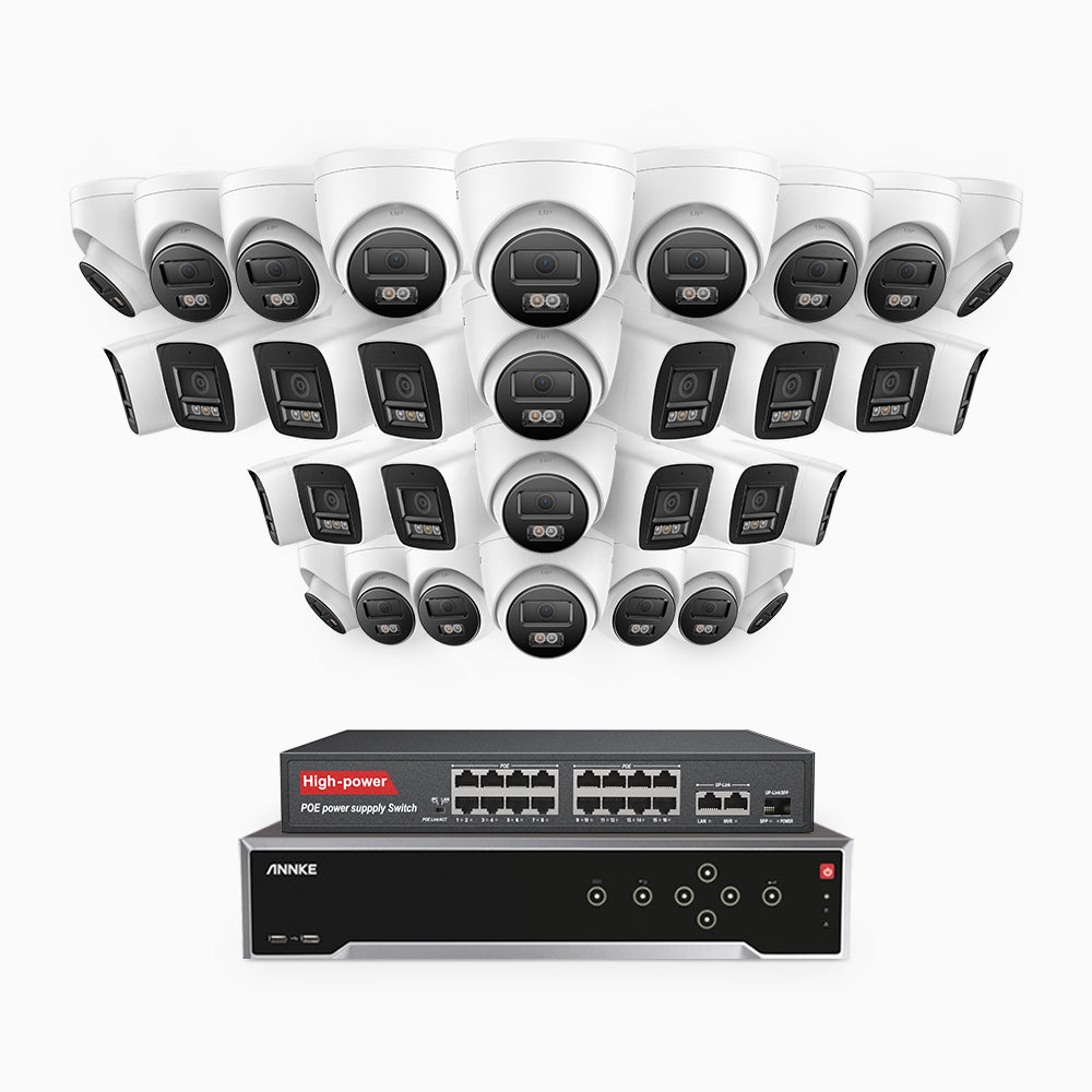 H800 - 4K 32 Channel PoE Security System with 14 Bullet & 18 Turret Cameras, Human & Vehicle Detection, Color & IR Night Vision, Built-in Mic, RTSP Supported, 16-Port PoE Switch Included