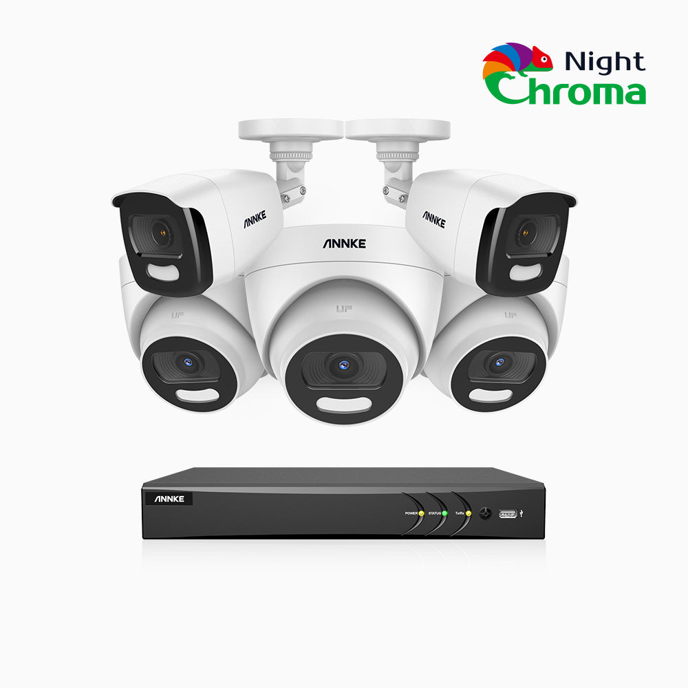 NightChromaTM NCK500 - 3K 8 Channel PoE Security System with 2 Bullet & 3 Turret Cameras, Acme Color Night Vision, f/1.0 Super Aperture, Active Alignment, Built-in Microphone, IP67 , All-Metal Housing